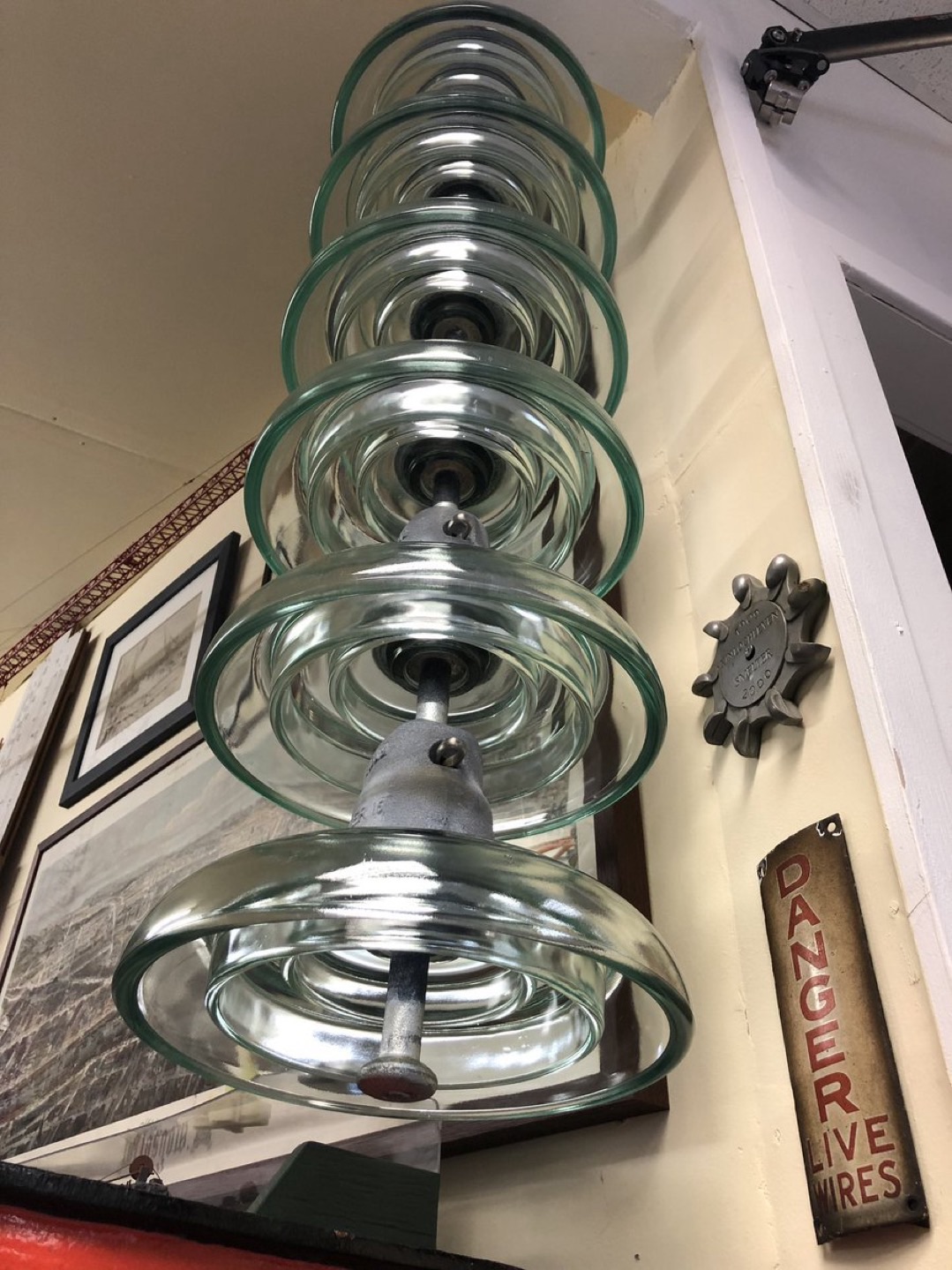 A stack of 6 glass insulators from a 33kV electricity pylon.