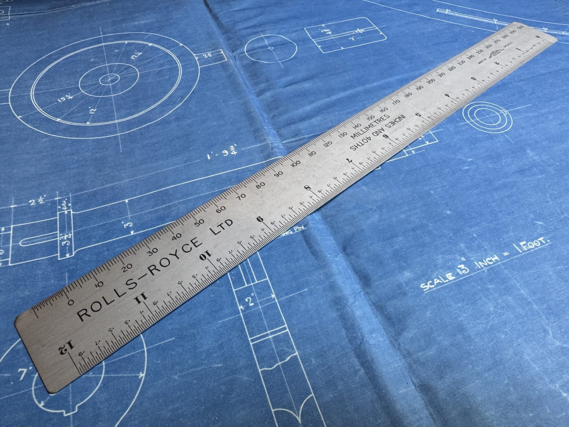 A steel ruler marked Rolls-Royce Ltd.