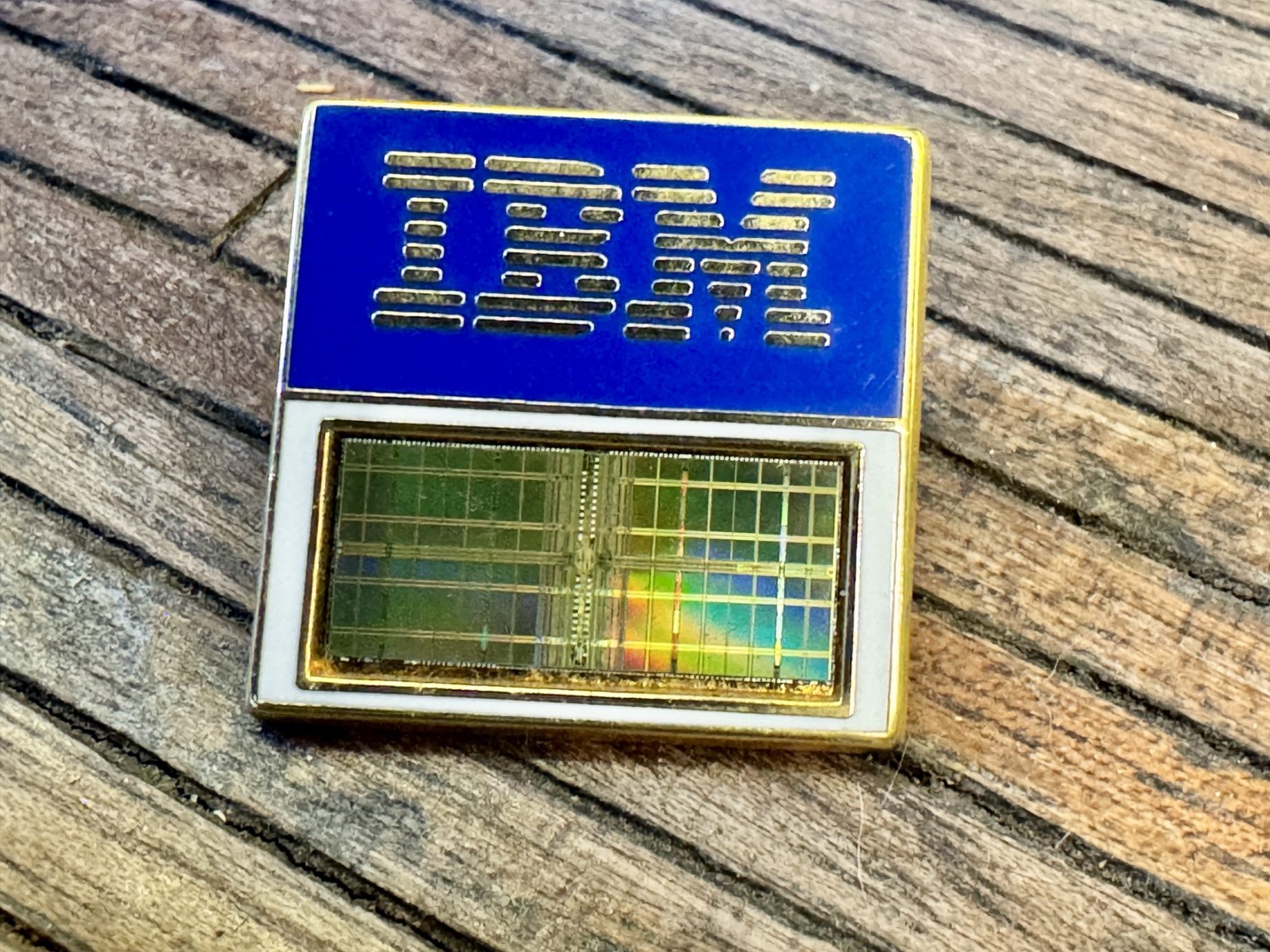 An enamel badge from IBM with a silicon chip embedded on it.