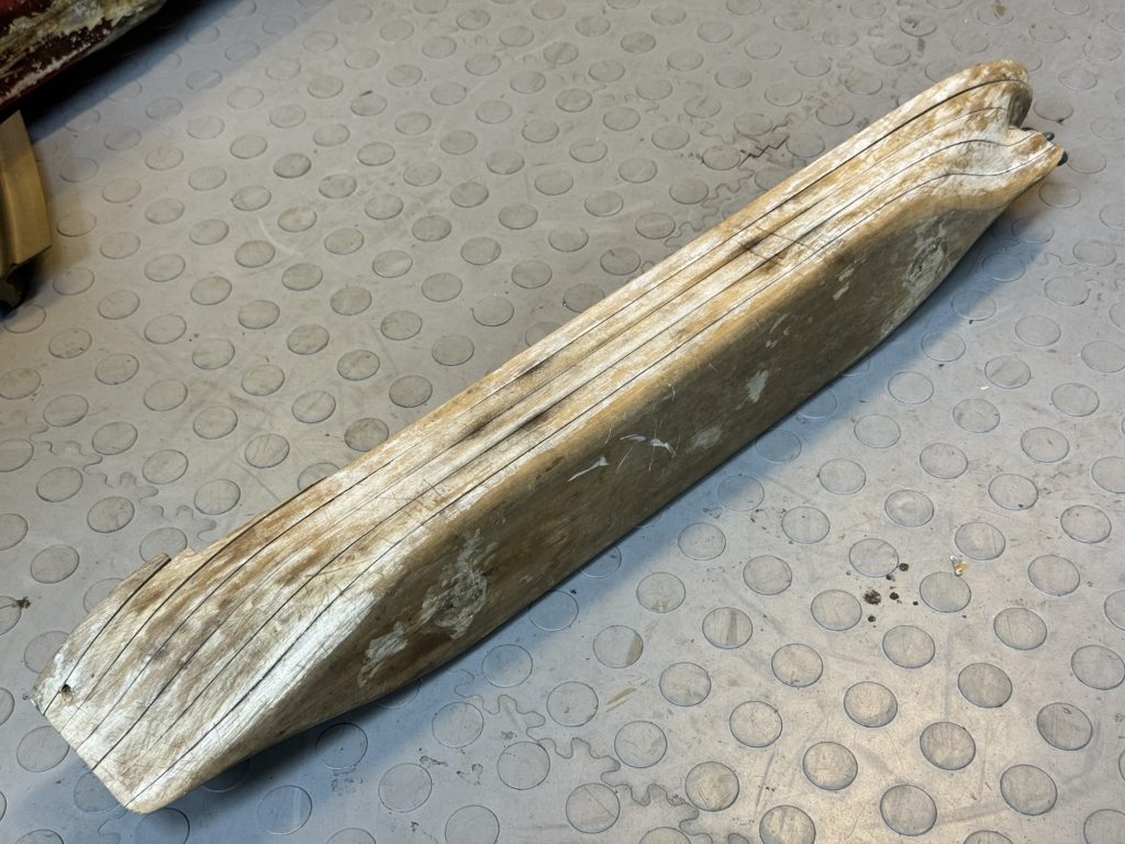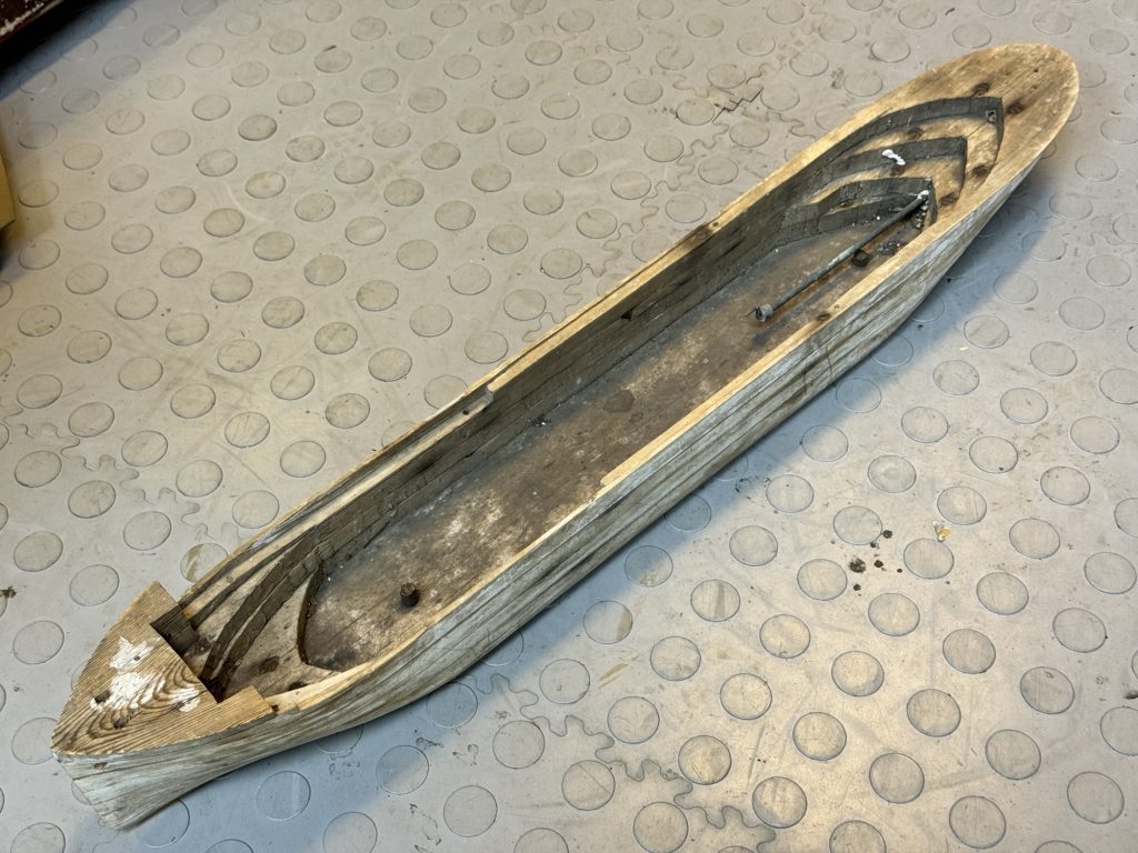 A model wooden ship hull, origin unknown.