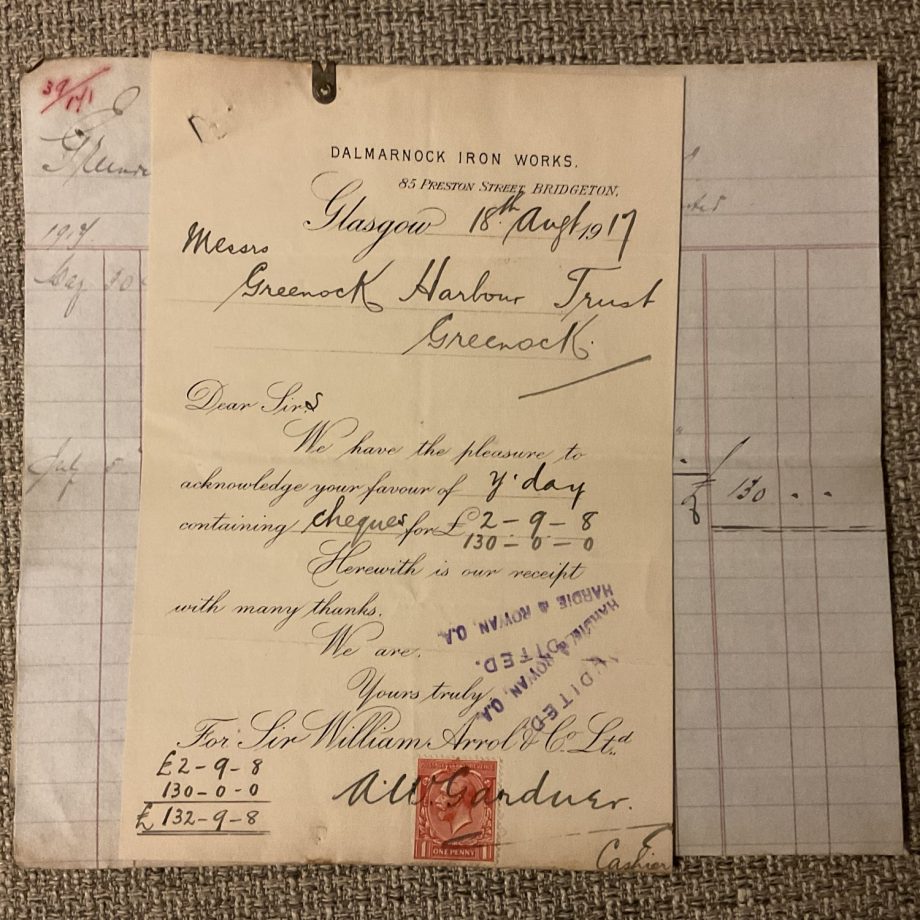 A 1917 bill and receipt from Sir William Arrol & Co to the Greenock Harbour Trust.